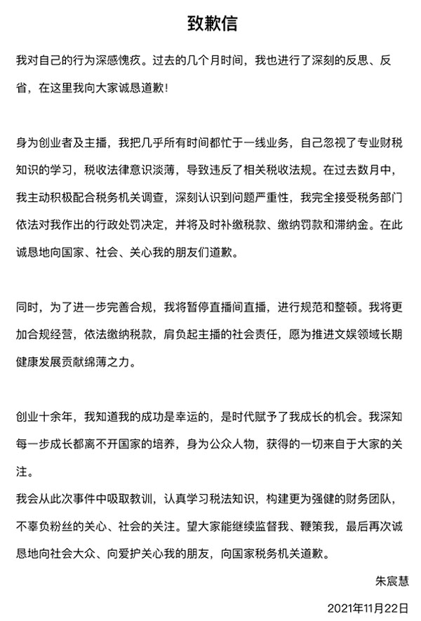 ● 雪梨(上圖)和林珊珊(下圖)表示將及時補繳稅款、繳納罰款和滯納金,同時將暫停直播間直播,進行規範和整頓。