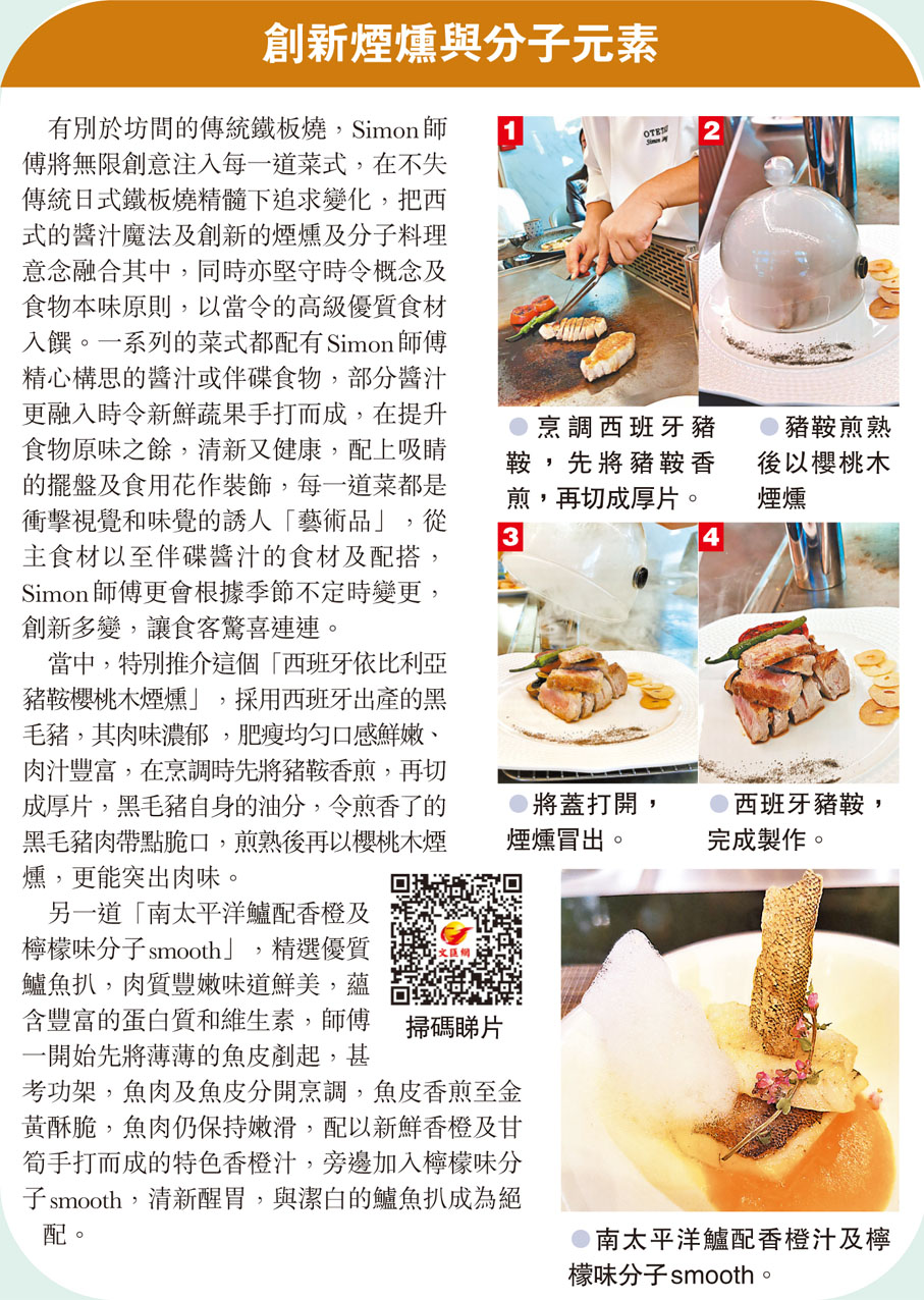 有別於坊間的傳統鐵板燒,Simon師傅將無限創意注入每一道菜式,在不失傳統日式鐵板燒精髓下追求變化,把西式的醬汁魔法及創新的煙燻及分子料理意念融合其中,同時亦堅守時令概念及食物本味原則,以當令的高級優質食材入饌。一系列的菜式都配有Simon師傅精心構思的醬汁或伴碟食物,部分醬汁更融入時令新鮮蔬果手打而成,在提升食物原味之餘,清新又健康,配上吸睛的擺盤及食用花作裝飾,每一道菜都是衝擊視覺和味覺的誘人「藝術品」,從主食材以至伴碟醬汁的食材及配搭,Simon師傅更會根據季節不定時變更,創新多變,讓食客驚喜連連。