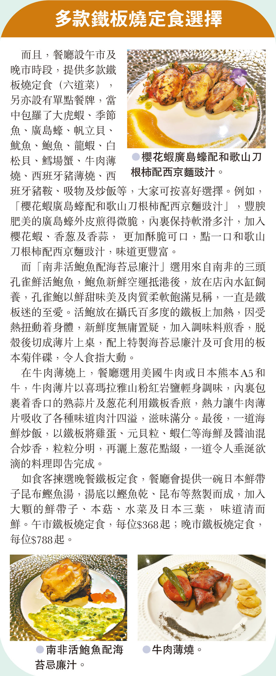 而「南非活鮑魚配海苔忌廉汁」選用來自南非的三頭孔雀鮮活鮑魚,鮑魚新鮮空運抵港後,放在店內水缸飼養,孔雀鮑以鮮甜味美及肉質柔軟飽滿見稱,一直是鐵板迷的至愛。活鮑放在攝氏百多度的鐵板上加熱,因受熱扭動着身體,新鮮度無庸置疑,加入調味料煎香,脫殼後切成薄片上桌,配上特製海苔忌廉汁及可食用的板本菊伴碟,令人食指大動。