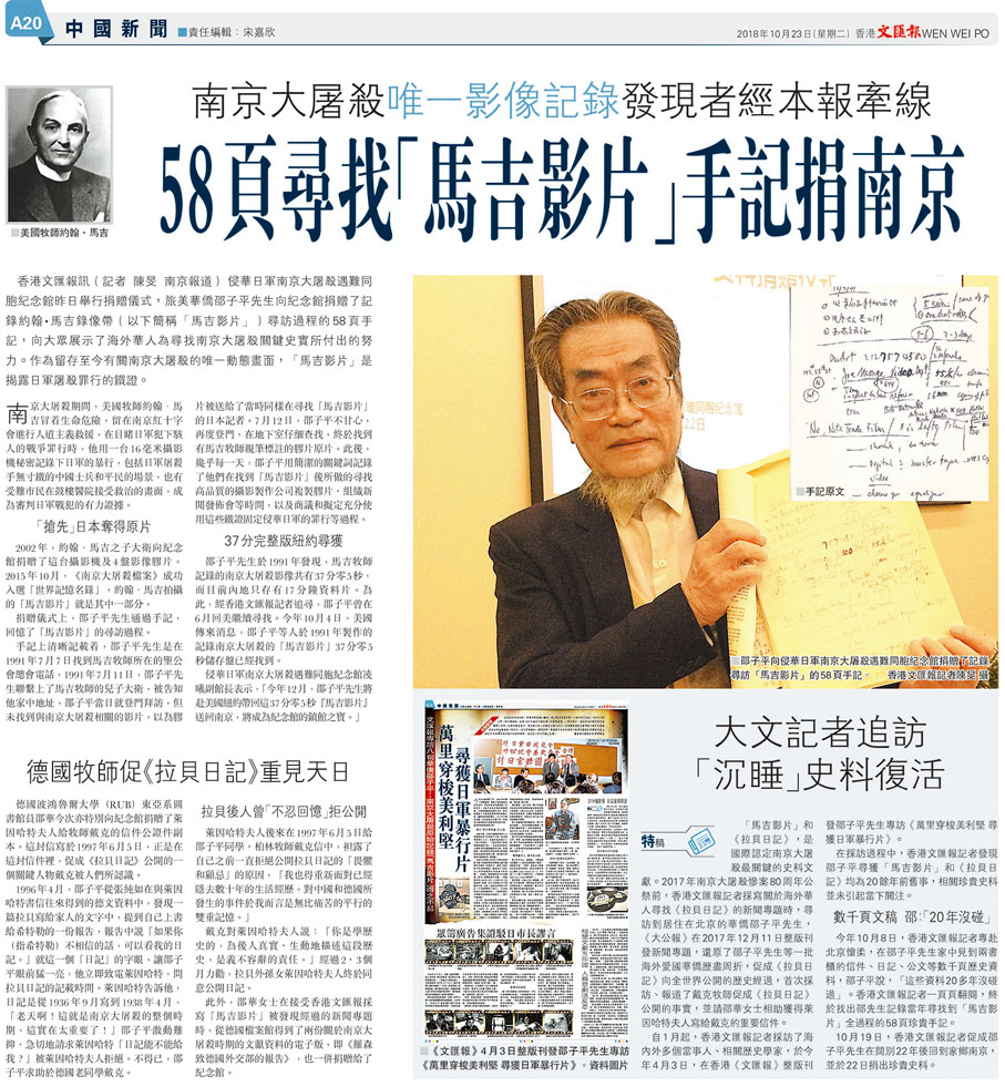 美籍華人跨洋寄贈本報南京大屠殺珍貴文獻 馬吉牧師塵封家書曝光 日軍暴行添新證