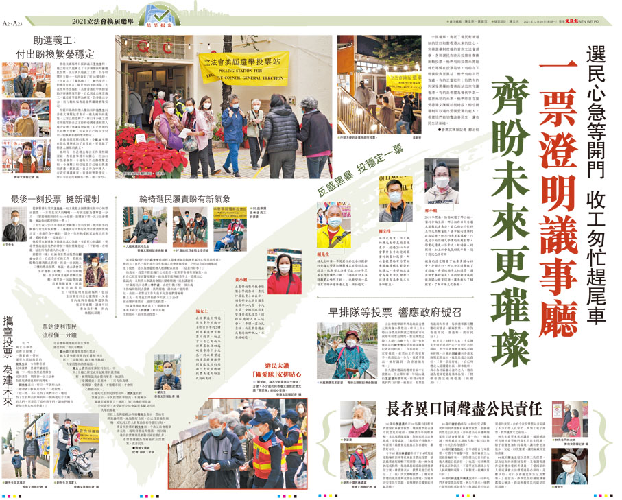 一張選票,寄託了選民對新選制的信任和對香港未來的信心。完善選舉制度後的首次立法會選舉,各區選民在昨天投票日齊齊出動投票,他們有的投票未開始就已等候在投票站外,有的在下班後飛奔至票站;他們有的年近百歲、有的正當壯年;他們有的因深受黑暴的毒害而站出來守護香港,有的是希望為後代爭取一個更光明的未來。他們昨日在接受香港文匯報訪問時說,相信新選制可以選出愛國愛港的能人,希望他們能切實改善民生,讓市民生活幸福。 ●香港文匯報記者 鄭治祖