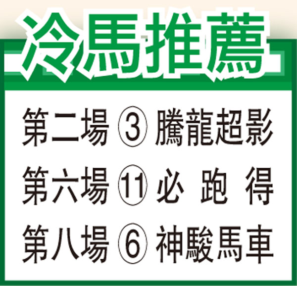 第二場、第四班、一二○○米。「騰龍超影」上季在四班取得兩捷,升上三班後也跑了多場位置,九歲馬未見大幅退化之餘,更有點迴光勇,谷草千二米更加獨沽一味,踏入今季十歲依然獲得幕後保留應有後着;上場排十二檔跟跑未動聲色,如今次形勢好一點應能復見真身,不宜因年邁而小覷。