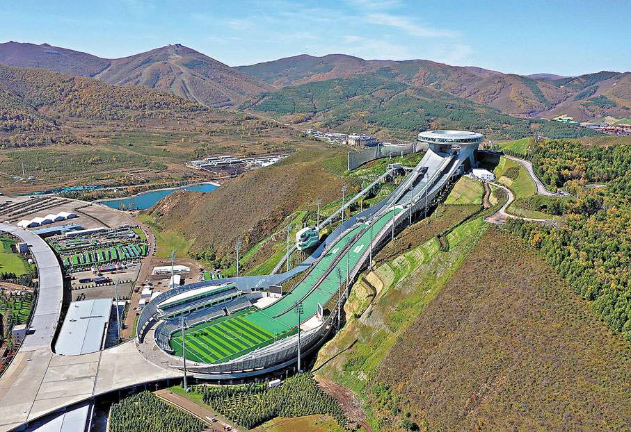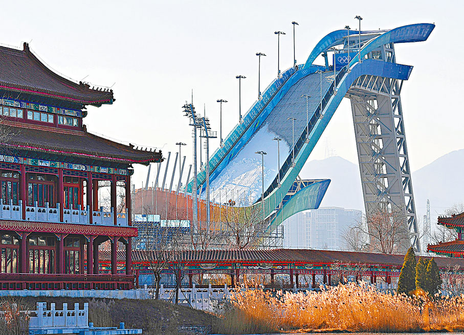 在張家口賽區,有一座新建場館,名為國家跳台滑雪中心,是中國首座符合國際標準的跳台滑雪場地,北京2022年冬奧會期間將承辦跳台滑雪、北歐兩項2個分項的8個小項比賽。作為北京冬奧會的「明星」場館,它擁有世界上最長的跳台滑雪賽道,在頂部出發區設置有大型懸挑建築物,其滑道分為HS140大跳台和HS106標準跳台,落差分別約為136米和115米,因造型似中國傳統飾物如意,故國家跳台滑雪中心也被稱為「雪如意」。