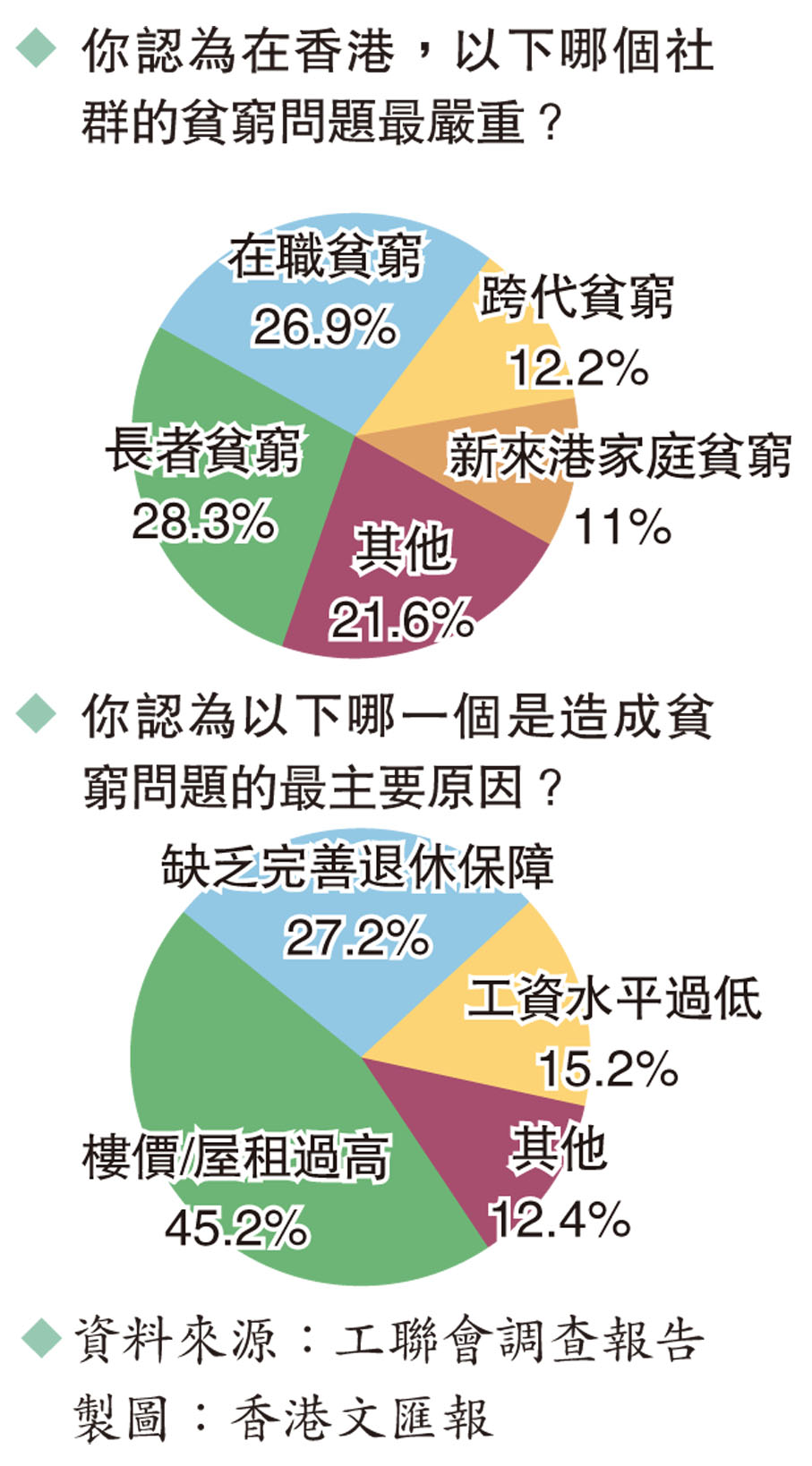 工聯會於本月9日至20日期間以網上問卷方式訪問近700名市民,了解他們對香港貧窮問題的意見。逾八成受訪者認為香港現時貧窮問題情況嚴重或非常嚴重,受訪市民認為尤其嚴重的貧窮問題依次為「長者貧窮」(28.3%)、「在職貧窮」(26.9%)及跨代貧窮(12.2%)。45.2%受訪者認為樓價及房租過高是造成貧窮的主要原因,其次為「缺乏完善退休保障」和「工資水平過低」。高達96.1%受訪者認同設立減貧目標。93.8%受訪者認為月入4,400元不夠一個人在香港維持基本生活。
