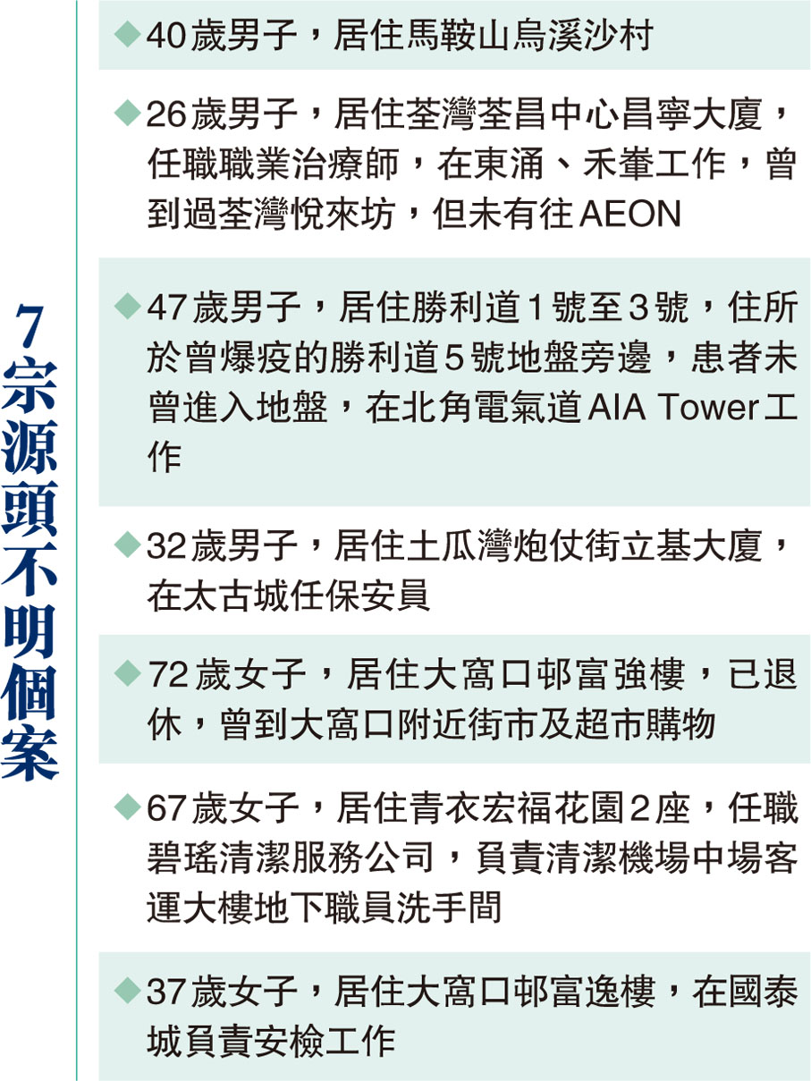 機場則有兩宗源頭不明個案,包括67歲於機場中場客運大樓工作的清潔工人,她主要負責清潔職員洗手間,本身住青衣宏福花園2座。一名37歲在國泰城任職安檢的保安員,本身居於大窩口邨富逸樓,與上述的清潔工人並無接觸,由於兩人住處附近亦有確診個案,未知是機場輸入個案,還是香港社區傳播。