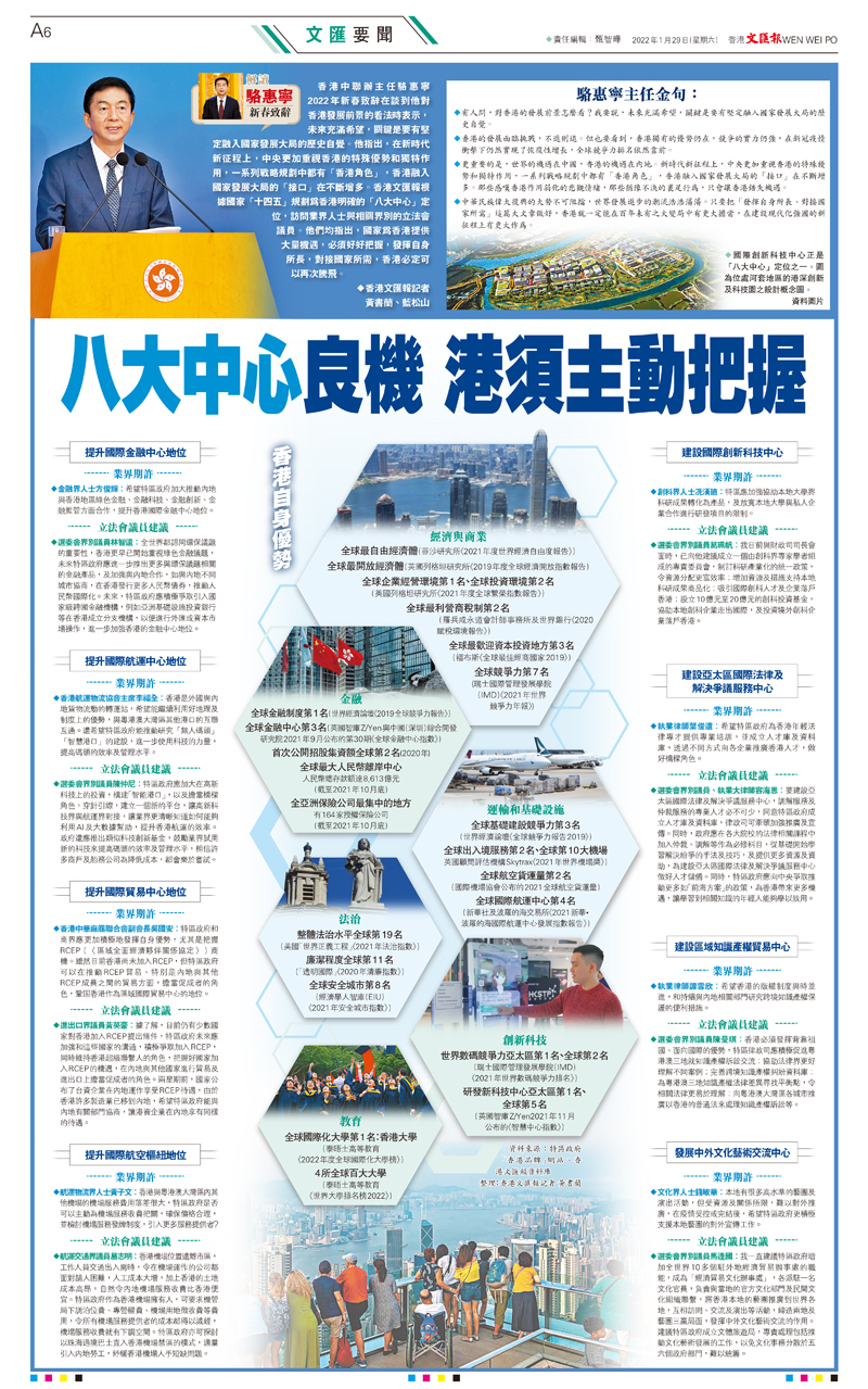 香港中聯辦主任駱惠寧2022年新春致辭在談到他對香港發展前景的看法時表示,未來充滿希望,關鍵是要有堅定融入國家發展大局的歷史自覺。他指出,在新時代新征程上,中央更加重視香港的特殊優勢和獨特作用,一系列戰略規劃中都有「香港角色」,香港融入國家發展大局的「接口」在不斷增多。香港文匯報根據國家「十四五」規劃為香港明確的「八大中心」定位,訪問業界人士與相關界別的立法會議員。他們均指出,國家為香港提供大量機遇,必須好好把握,發揮自身所長,對接國家所需,香港必定可以再次騰飛。 ◆香港文匯報記者黃書蘭、藍松山