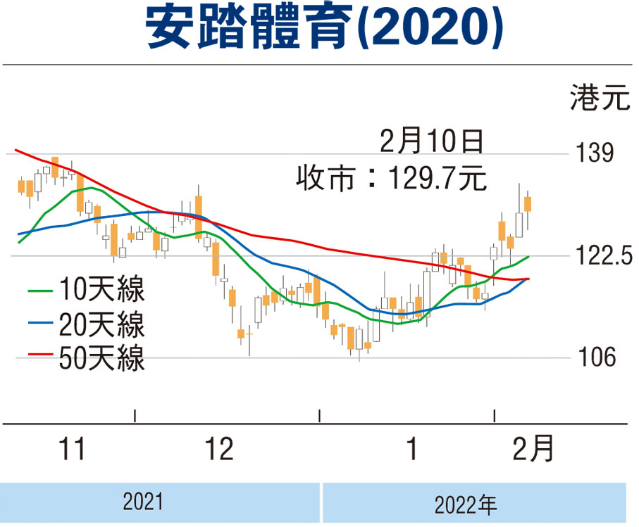 北京冬季奧運會上周開幕,市場憧憬對體育用品帶來商機,體育用品股伺機造好。在政策層面上,國務院早前印發《全民健身計劃》,目標到2025年全民健身公共服務體系更加完善,預料帶動中國體育產業總規模達到5萬億元(人民幣,下同)。另外,國家體育總局計劃在「十四五」期間,將新建、改擴建逾1,000個體公園,同時,加強全民建身器材配建管理等。