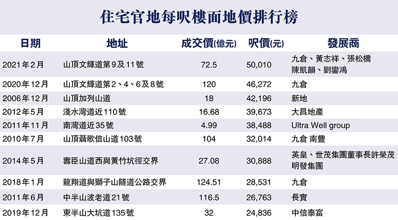 值得留意的是,目前市場對地皮估值相當高,介乎10.3億元至14.3億元,每平方呎樓面地價估值最低亦要5.4萬元,而最高估值更去到7.5萬元。翻查資料,本港對上地價紀錄於去年2月出現,當時山頂文輝道第9及11號由九倉牽頭的財團投得,地價高達72.5億,而每方呎樓面地價更達到50,010元,以每呎樓面地價計創下本港住宅地史上最貴。換言之,即使以目前市場上最低估值計算亦高過歷史紀錄,即項目極大可能再創新高,問鼎地王。