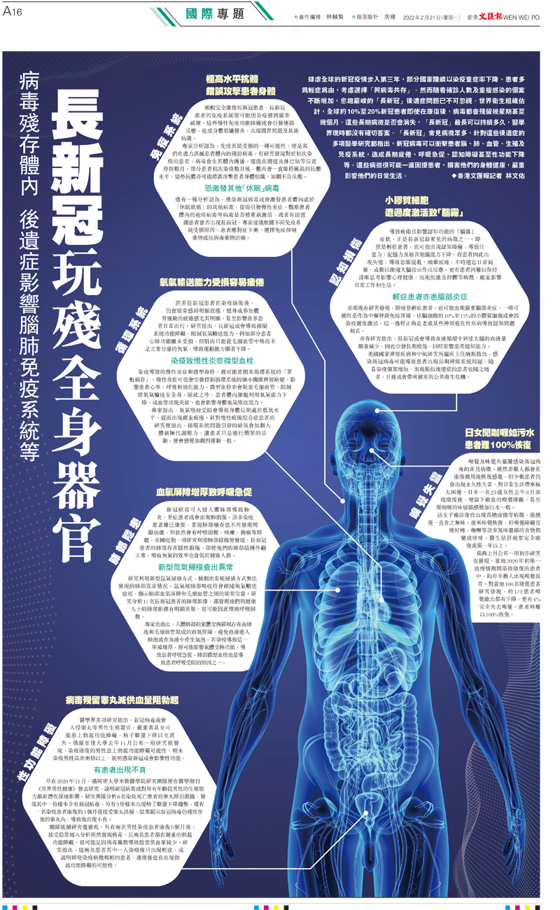 肆虐全球的新冠疫情步入第三年,部分國家陸續以染疫重症率下降、患者多為輕症為由,考慮選擇「與病毒共存」。然而隨着確診人數及重複感染的個案不斷增加,愈趨嚴峻的「長新冠」後遺症問題已不可忽視。世界衞生組織估計,全球約10%至20%新冠患者即使在康復後,病毒都會殘留幾星期甚至幾個月。這些長期病徵是否會消失,「長新冠」最長可以持續多久,醫學界現時都沒有確切答案。「長新冠」常見病徵眾多,針對這些後遺症的多項醫學研究都指出,新冠病毒可以衝擊患者腦、肺、血管、生殖及免疫系統,造成長期疲倦、呼吸急促、認知障礙甚至性功能下降等。這些病徵很可能一直困擾患者,損害他們的身體健康,嚴重影響他們的日常生活。 ◆香港文匯報記者 林文佑