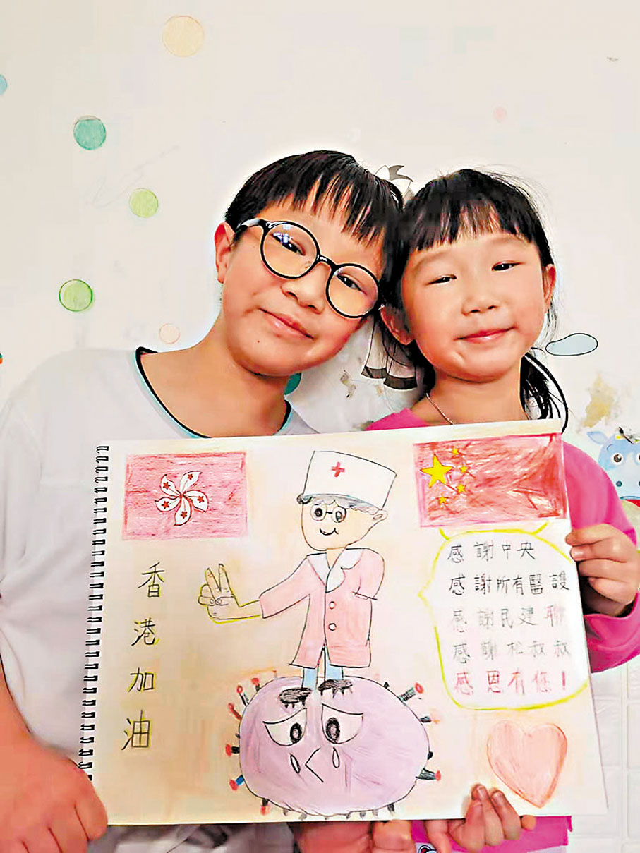英雄在前線拚搏,小朋友在後方打氣。曾是中學教師的民建聯荃灣梨木樹東社區幹事劉松剛近日以身作則,每天為求助街坊送遞糧食及生活必需品,日前更組織了約30名4至9歲小朋友向抗疫英雄說些心裏話,小朋友們各自用畫筆一筆一畫繪製畫作,用不同圖像和文字,表達他們對祖國支援香港的感謝和對前線醫護的敬佩。他們還製作短片,向醫護工作者說加油,感恩他們守護香港,希望這些白衣天使在工作中記得保護自己,平平安安。◆香港文匯報記者 黃書蘭