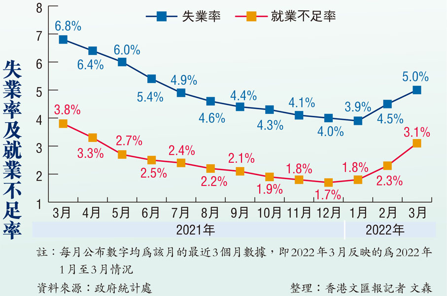 香港文匯報訊(記者 文森)第五波疫情令香港經濟飽受打擊。特區政府統計處昨日公布今年1月至3月失業率的臨時數字,較去年12月至今年2月的4.5%上升至5.0%,就業不足率亦由2.3%上升至3.1%,幾乎所有主要經濟行業的失業率及就業不足率均見上升,新增5.47萬人失業或開工不足,總失業人口增加至逾18.8萬人,惟勞工處同期錄得的每月平均職位空缺則下降20.5%。勞工及福利局局長羅致光預計,勞工市場在短期內仍將繼續受壓。