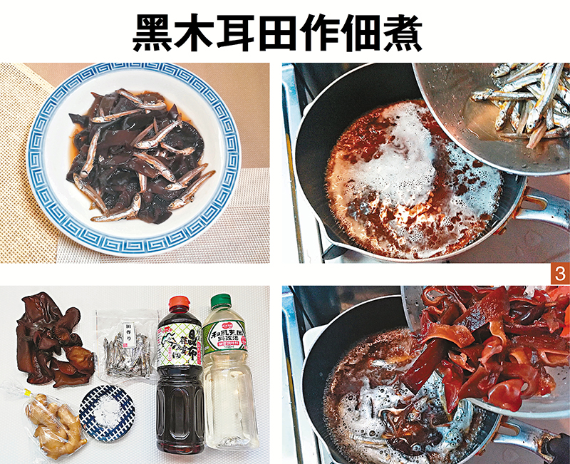 3. 小鍋內注入水2杯,加入調味煮至沸騰成為煮汁,將浸軟瀝乾的田作、切妥備用的新鮮黑木耳及薑片加入,大火煮沸後轉中小火熬煮約40分鐘至煮汁轉濃即成。