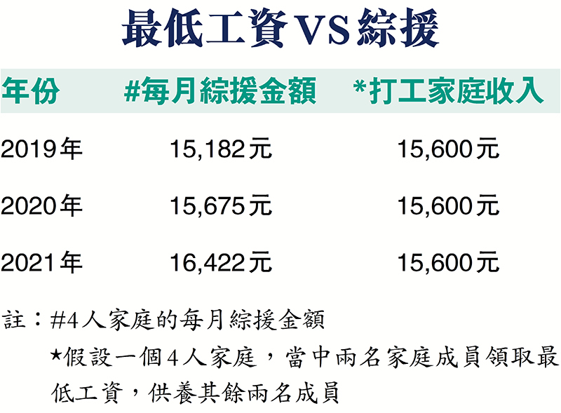 工聯會立法會議員郭偉强表示,最難以接受的是「最低工資失去了其意義,反而在製造貧窮、鼓勵領取綜援,完全脫離最低工資制度的初心」。他以一個四人家庭為例子,若當中兩名成員打工領取最低工資,供養另外兩名成員,全職每日工作8小時、每月開工26天,兩人月入僅15,600元,而四人家庭目前的平均每月綜援金額為16,422元,已高於前者5.3%。