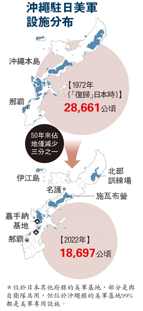 美軍位於沖繩的專用設施面積截至今年1月為18,483公頃,儘管50年來減少約34%,但因為沖繩縣外日本其他府縣的美軍設施持續縮減,導致沖繩美軍設施佔全國比例不減反增。目前有多達70.3%的駐日美軍設施集中在面積僅佔日本國土約0.6%的沖繩,比例遠超於50年前的58.7%。