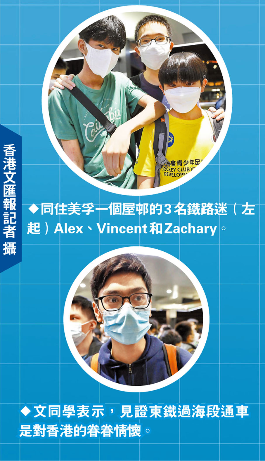 26歲的Vincent和13歲的Alex及Zachary是同住美孚一個屋邨的「忘年之交」,他們昨日遠道而來,見到有如此多市民有共同愛好,感到甚是開心。Zachary表示,自幼就非常喜歡鐵路,更因這項愛好與朋友結緣,三人共同經歷過海段通車更令這段友誼又深刻一分。