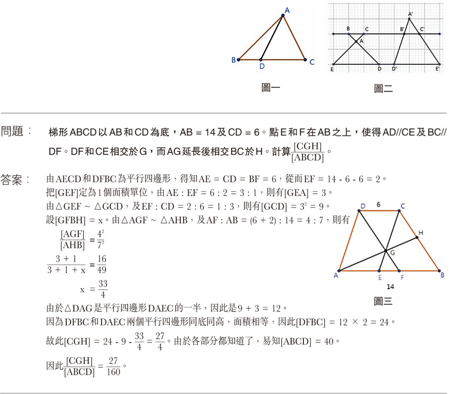 圖一和圖二兩個想法,大致上就可以解決很多面積比的問題。