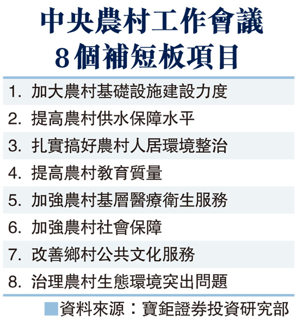 最後,則是農村基礎建設及水利相關股份。是次會議8項補短板項目中,其中兩點有提及要加大農村基礎設施建設力度及提高農村供水保障水平,原因是內地農村的基建並未完善,雖然在食水供應上不成問題,但一些地方的生產用水、生產用電或灌溉設施則因配套不足而難以應用,從而影響農作物的生產,而農作物的收成亦正正與農民的收入掛�u,農村基建的重要性不言而喻,加上內地已對地方債進行改革,可以預期相關資金在本年度將能更有效地達到基建項目上,因此農村基建及水利相關的股份將成為值得留意的板塊。農業農村發展為內地重點發展方向之一,投資者不妨多留意以上板塊或能從中找到投資機遇。■題為編者所擬。本版文章,為作者之個人意見,不代表本報立場。