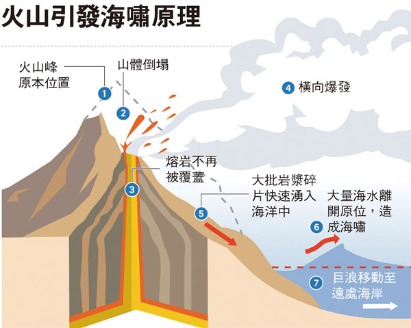 歷史上亦曾發生多宗火山海嘯,最大規模一次相信是在1883年8月26日,位於印尼的喀拉喀托火山爆發,引發的巨浪高達41米,爪哇、蘇門答臘等地區全被波及,造成近4萬人死亡。日本九州長崎縣島原半島中央的雲仙岳火山在1792年爆發時,發生山體崩塌,海嘯的巨浪高達50米,導致島原、天草及肥後(今熊本)3地約1.5萬人死亡。 ■綜合報道