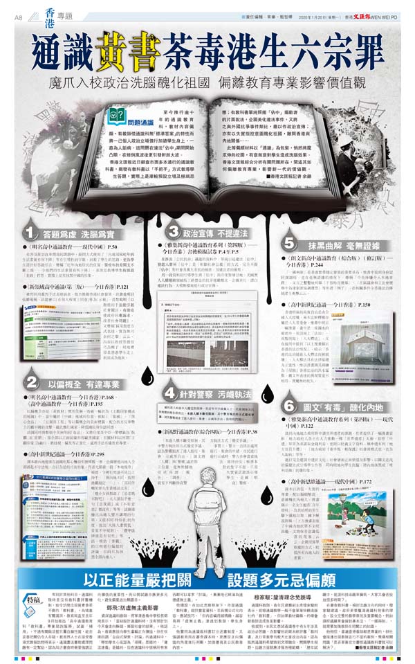 香港文匯報近日翻查市面多本通行的通識教科書,揭發有教科書以「手把手」方式教導學生答題,實際上是灌輸預設立場及極端思想;有教科書單純照搬「佔中」煽動者的片面說法,企圖美化違法事件,又將之與外國抗爭事件類比,藉以作政治宣傳;亦有以失實指控意圖醜化祖國,離間香港與內地關係......