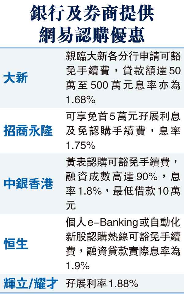 大新銀行(2356)則為較高額貸款用戶提供1.68%的貸款利率,客戶親臨大新各分行申請網易新股認購貸款,可豁免手續費,若貸款額達50萬至500萬元,貸款利率亦低至1.68%。此外,�琤矷]0011)客戶經個人e-Banking或自動化新股認購熱線認購網易,可獲豁免認購新股手續費,若申請新股貸款,可享特惠貸款年利率,實際年利率為1.9%。