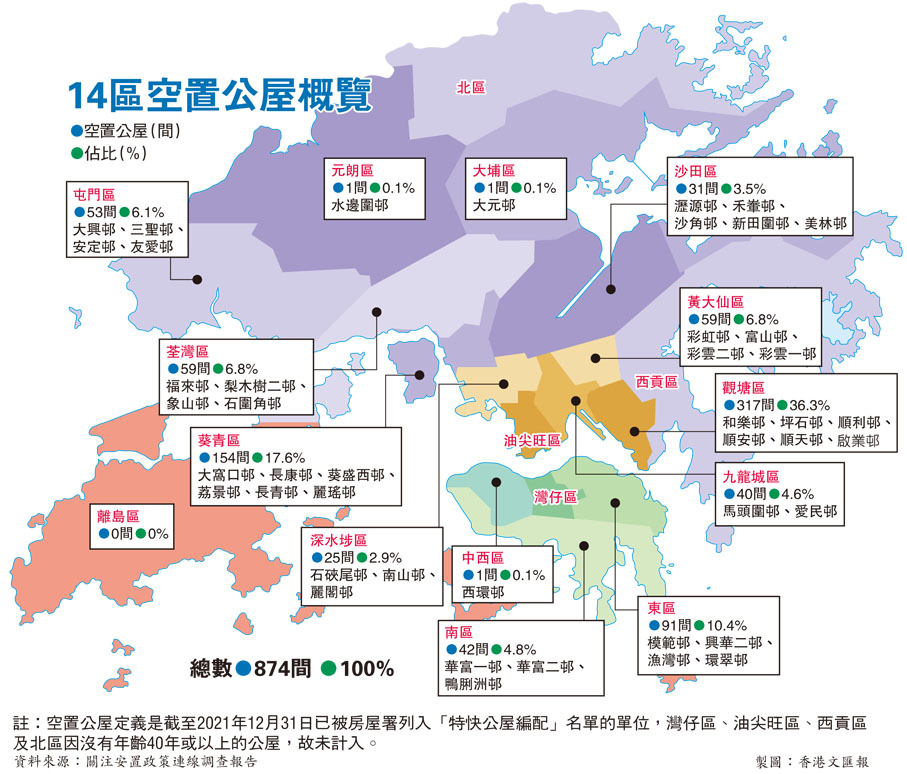 結果顯示,全港13個區有入伙年期達40年或以上的公共屋邨,合共 45個屋邨,截至去年底,874個單位處於空置狀態,其中劏房林立的觀塘區有317個(佔36.3%),葵青區亦有154個(佔17.6%)。空置年期方面,49.1%單位已空置12個月或以上,空置逾兩年的單位數目有139個,佔32.4%。