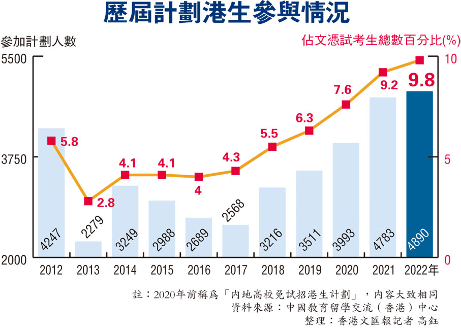 香港學生內地升學熱持續升溫。雖然近年本港適齡中學畢業生有所減少,但參與「內地高校招收香港中學文憑試學生計劃(文憑試招生計劃)」的人數就「逆市」增加,昨日公布的2022年最新數據顯示,共有4,890名學生透過計劃報讀內地120多所大學,佔今年文憑試生總數一成,申請人數及比率均創歷屆文憑試的新高。按學科計,以經管、醫學及工程類最受港生歡迎。負責執行招生計劃的中國教育留學交流(香港)中心指,內地升學熱說明更多港生對國家經濟社會發展前景有信心,而內地大學教研水平提升,也對港生愈見吸引力。◆香港文匯報記者 高鈺