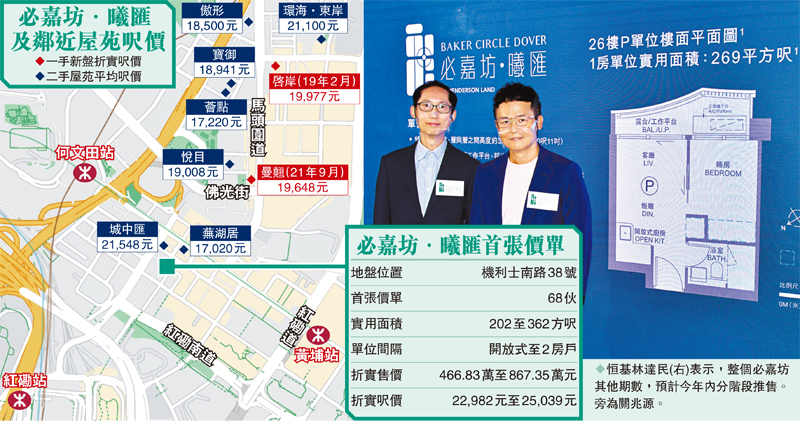 多個新盤部署開賣,軟銷多時的恒地紅磡大型重建項目必嘉坊正式登場,發展商昨日公布第一期第一座「必嘉坊·曦匯」首張價單,涉及68伙,面積202至362方呎,折實平均呎價23,888元,202方呎開放式入場單位折實賣466.83萬元。發展商形容首張價單為「後疫情價」,已有所折讓,並於今日開始收票及開放示範單位,最快下周開售。