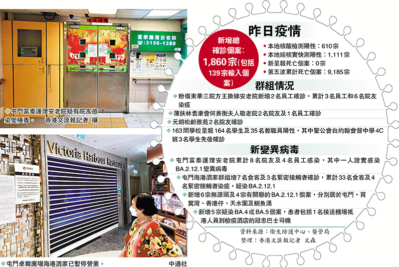 香港疫情持續反彈,昨日新增確診1,860宗,不但連續十日破千宗,更是4月11日以來單日最多,扣除當中139宗輸入病例外,本地感染個案有1,721宗。變異病毒繼續在社區擴散,包括新增21宗疑感染Omicron BA.2.12.1變異病毒的個案,其中屯門富泰護理安老院一名院友疑感染該變種病毒,屯門卓爾廣場海港酒家則新增7名食客及3名緊密接觸者染疫,累計有37人感染該病毒。此外,本地再新增5宗懷疑BA.4或BA.5的個案。