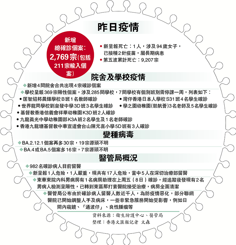 香港新冠肺炎疫情居高不下,昨日新增2,769宗確診個案(包括211宗輸入),再有一名94歲確診者離世。目前仍有近千名確診者在公立醫院留醫,已對公院服務造成影響,部分非緊急服務無可避免要減少,例如日間內窺鏡、心臟「通波仔」等,以騰出人手和病床抗疫。另外,近日深圳灣口岸個別過關期間發現核酸檢測陽性的旅客,折返自行離開,恐在香港社區「播疫」。衞生防護中心回應指,有鑑於部分確診者在現場遊走及徘徊,防護中心即將推出優化方案,如有需要或安排他們入住檢疫中心。