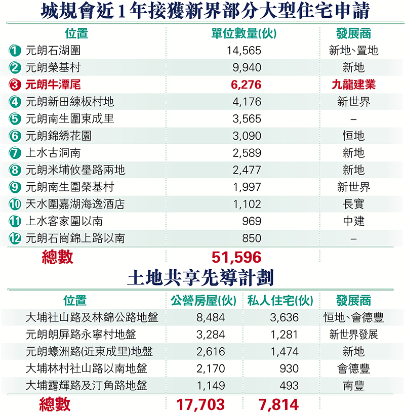 特區政府去年提出《北部都會區發展策略》,帶動大批於新界北持有土地的發展商向城規會提出規劃申請,最新一宗來自元朗牛潭尾一幅逾100萬方呎土地,九建申請改劃土地用途以興建一個大型住宅項目,將建22幢30至50層高住宅大廈及22幢3層高洋房,可建樓面約486.48萬方呎,計劃提供6,276伙,單位數量相當於沙田第一城(10,642伙)的六成。據香港文匯報粗略統計,過去一年來,發展商圍繞北都區的大型住宅規劃申請已近8萬伙(見表),成為今後本港住宅土地供應的重要來源。不過,值得留意的是,發展商是提出了改劃申請,但全部項目城規會仍在處理中,未獲批准。