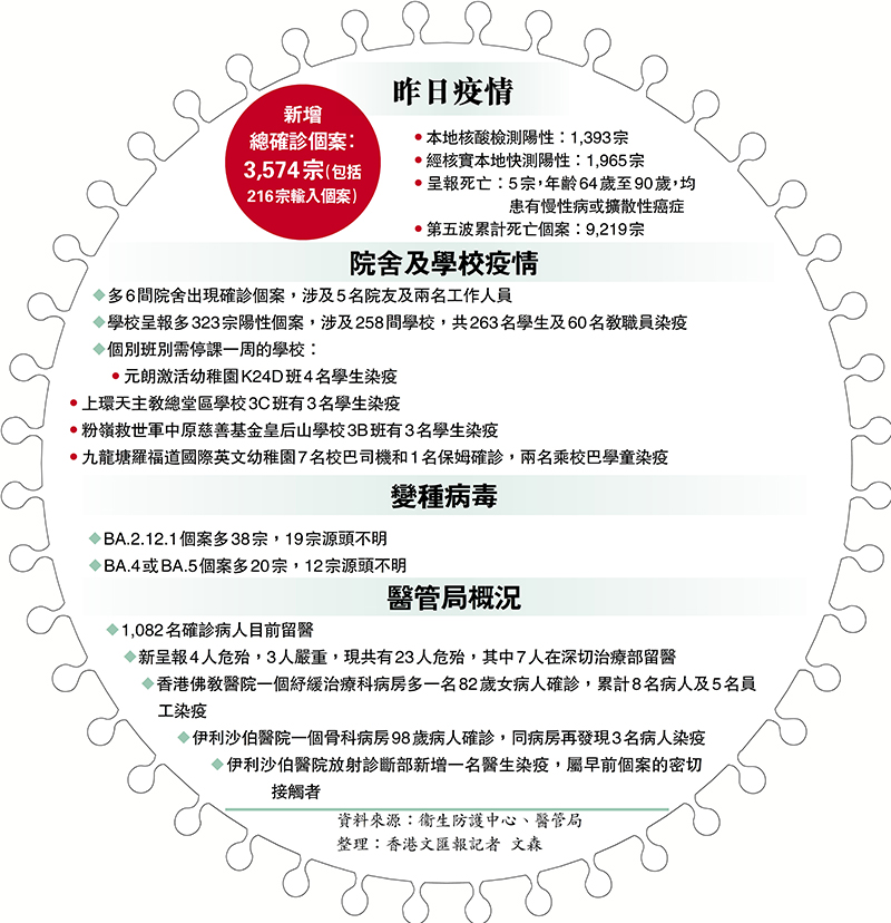 香港新冠肺炎疫情持續,昨日連續第三天突破3,000宗確診個案。新增的3,574宗染疫個案中,3,358宗為本地病例。多間學校和院舍繼續出現感染個案,其中,九龍塘羅福道國際英文幼稚園出現校巴群組,有7名校巴司機和1名保姆確診,其中一輛校巴有2名學童感染,相信有關校巴已出現病毒傳播情況,乘搭該輛校巴的26名學童需要停課一周。受感染學童雖然來自不同班別,但暫未在其他班級或校巴發現傳播情況。