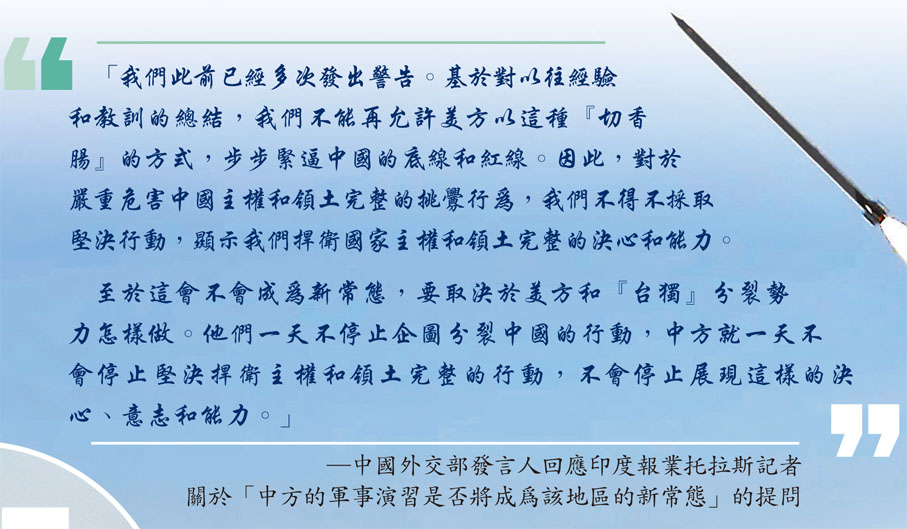 至於這會不會成為新常態,要取決於美方和『台獨』分裂勢力怎樣做。他們一天不停止企圖分裂中國的行動,中方就一天不會停止堅決捍衛主權和領土完整的行動,不會停止展現這樣的決心、意志和能力。」 —中國外交部發言人回應印度報業托拉斯記者