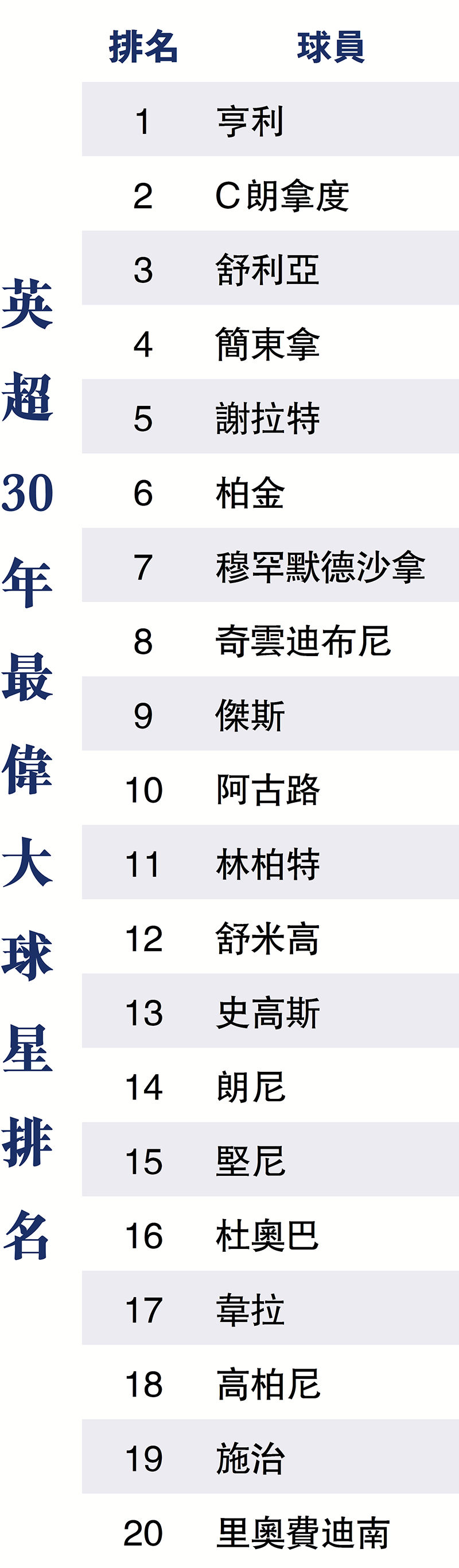 香港文匯報訊(記者 楊浩然)英國傳媒報道,當地一家網絡市場調查公司,調查了球迷心中誰是英超30年來最偉大球星,結果阿仙奴的法國名宿亨利,力壓C朗拿度和舒利亞等名將當選。