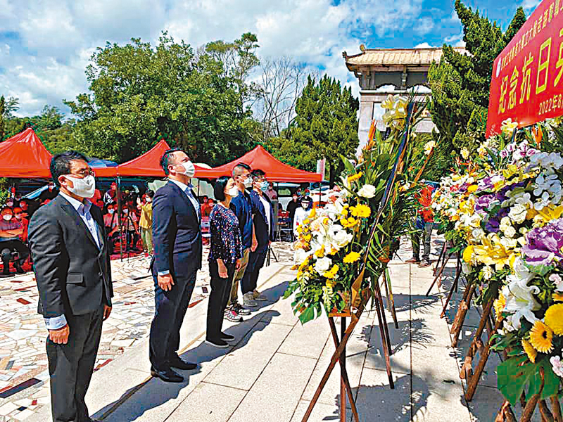 為悼念保衛香港而捐軀的抗日英烈,原東江縱隊港九獨立大隊老游擊戰士聯誼會昨日在西貢大網仔路斬竹灣烈士碑園舉辦紀念抗日英烈謁碑日悼念儀式。民政及青年事務局副局長梁宏正,立法會議員李世榮、陳曼琪等出席。