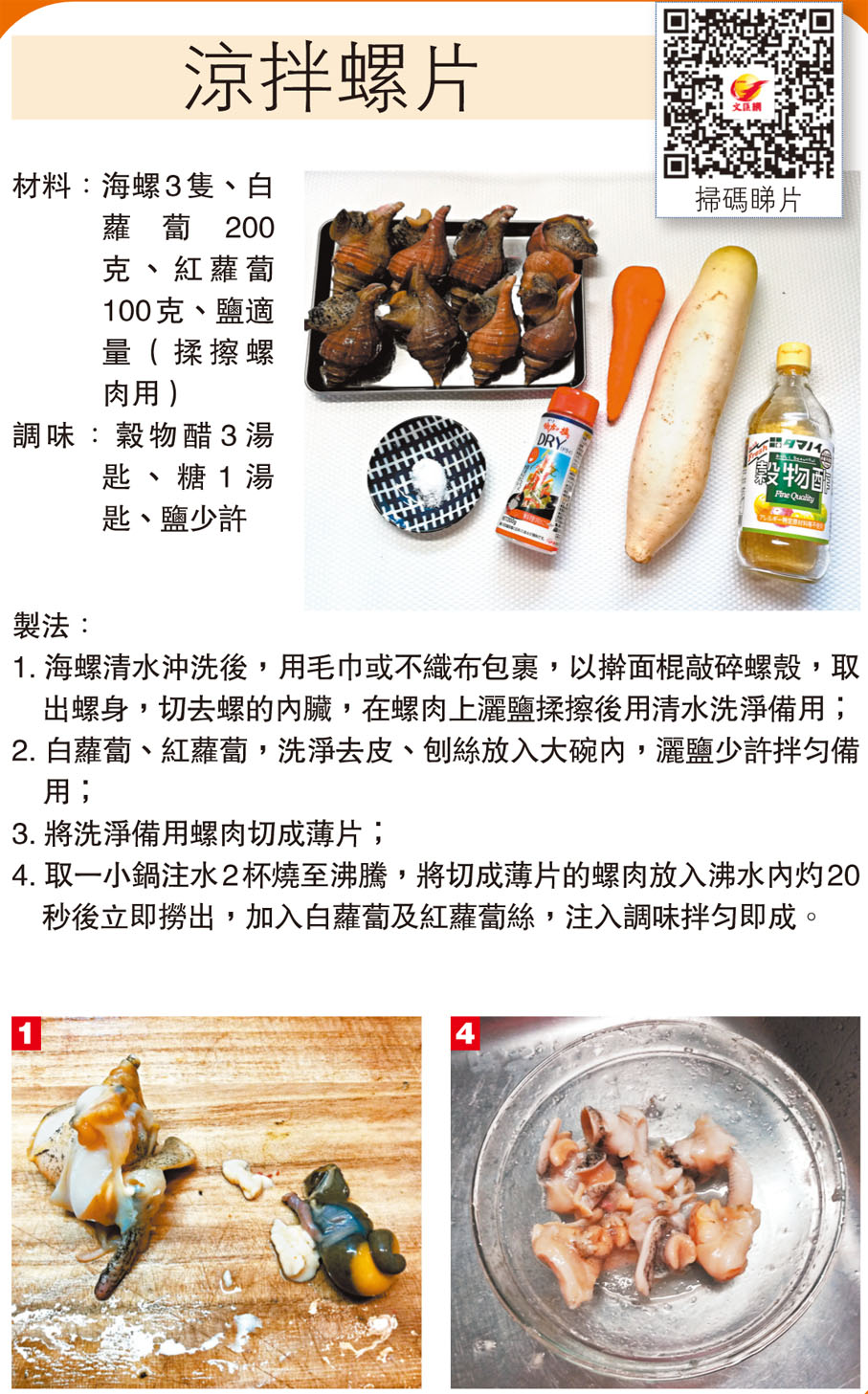 4. 取一小鍋注水2杯燒至沸騰,將切成薄片的螺肉放入沸水內灼20秒後立即撈出,加入白蘿蔔及紅蘿蔔絲,注入調味拌勻即成。