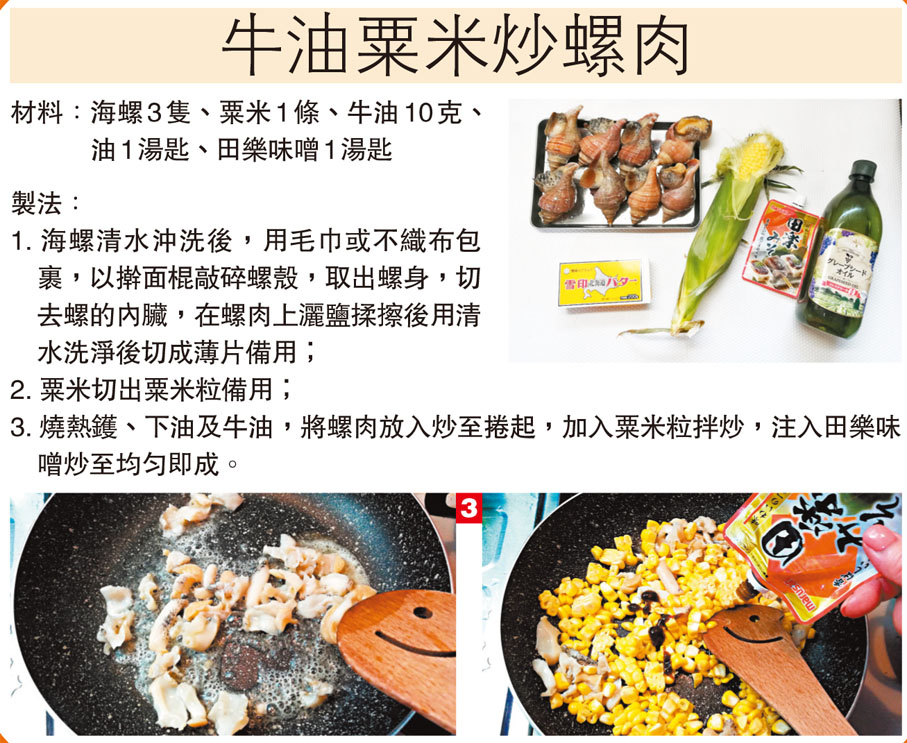 材料︰海螺3隻、粟米1條、牛油10克、油1湯匙、田樂味噌1湯匙