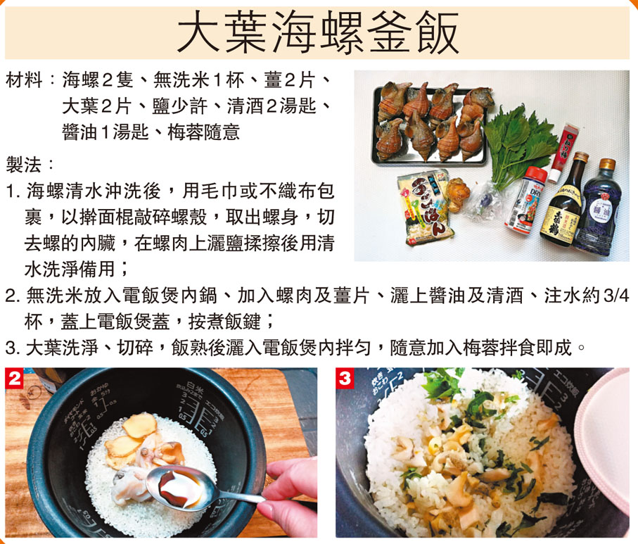 材料︰海螺2隻、無洗米1杯、薑2片、大葉2片、鹽少許、清酒2湯匙、醬油1湯匙、梅蓉隨意