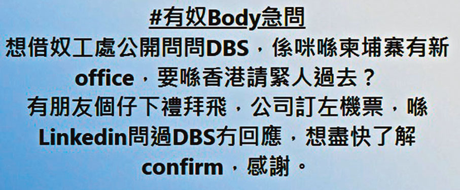 有網民在Facebook討論區上聲稱,有朋友收到DBS星展銀行的工作邀請,需到柬埔寨分行工作,公司已訂機票。