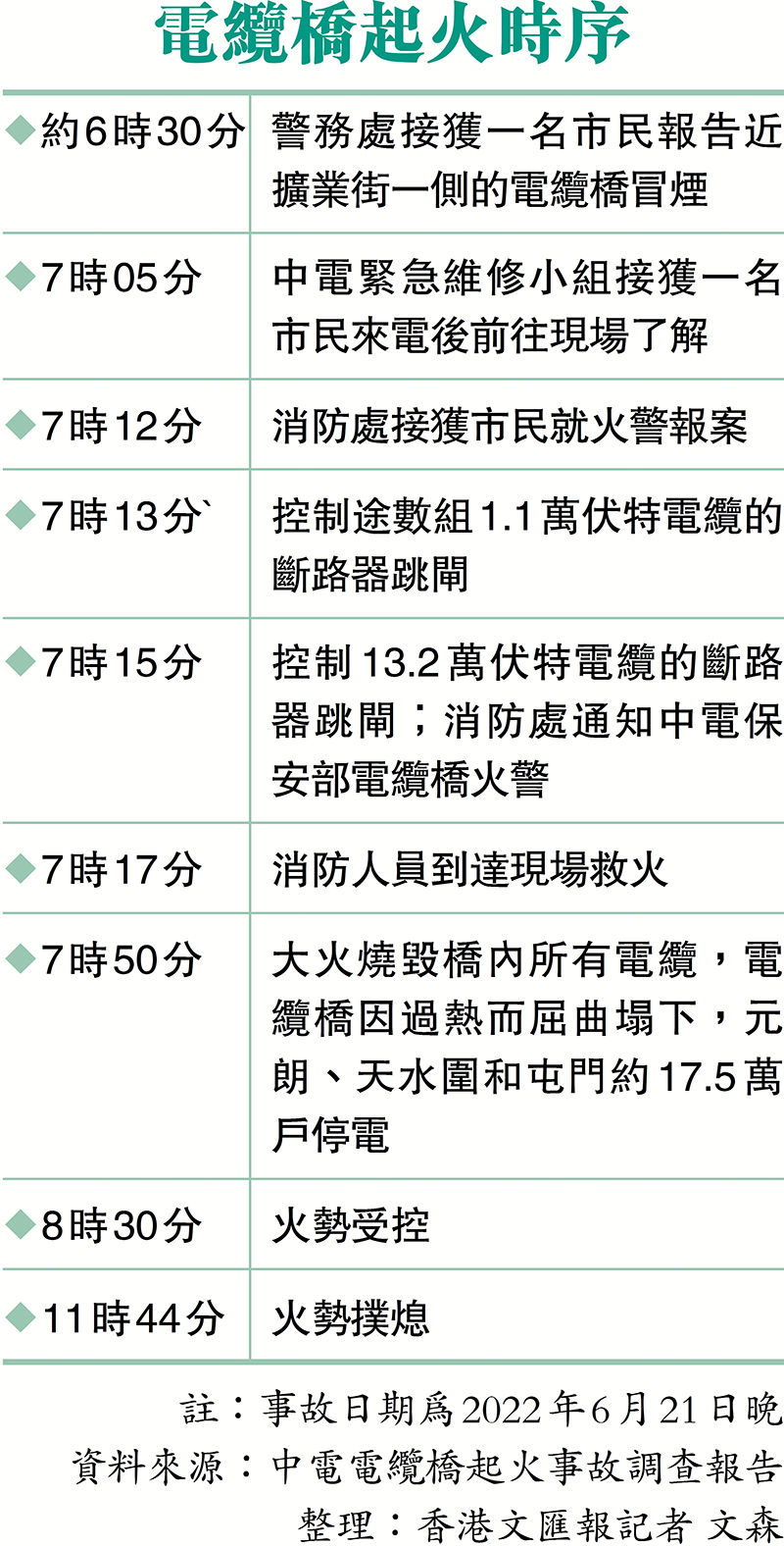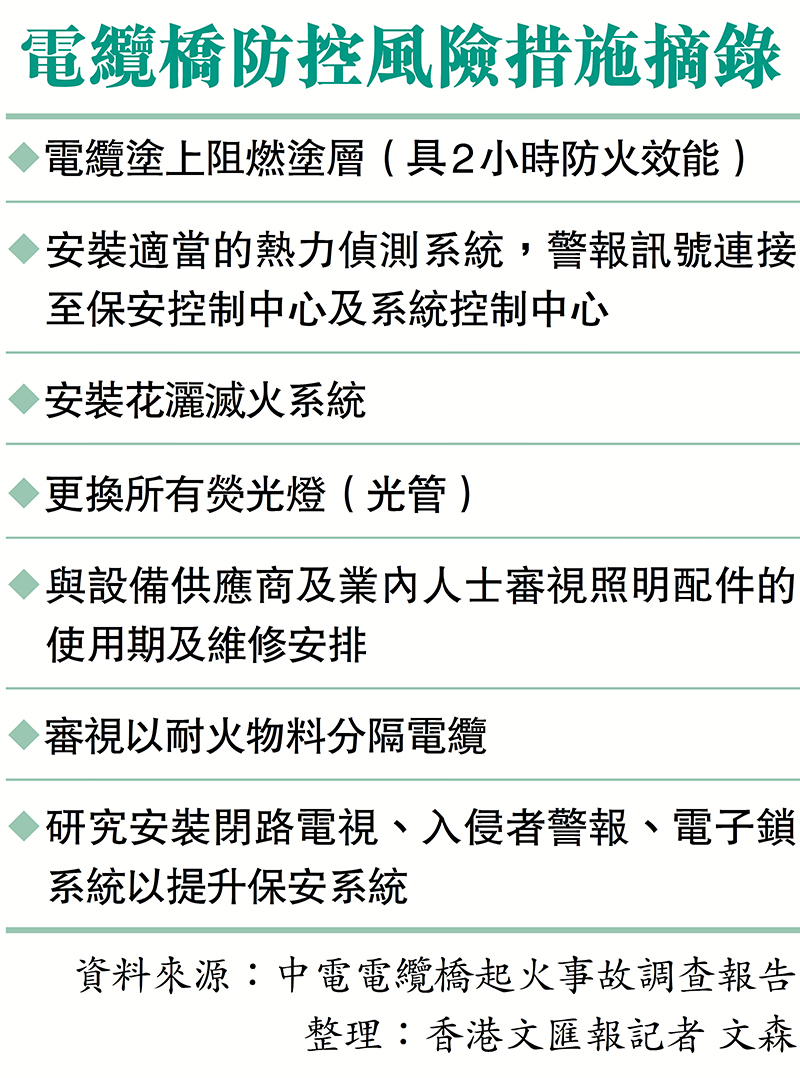 今年6月21日晚上約6時半,中電一條橫跨元朗宏樂街及擴業街明渠的電纜橋發生嚴重火警事故,導致元朗、天水圍及屯門約17.5萬戶停電,部分居民停電更長達13小時。由電力、土木工程及消防工程專家組成的調查小組,於本周一向機電工程署提交是次事故的最終報告,並獲原則上認同報告關於起火的成因和改善方案。中電昨日舉行記者會,公開共25頁的調查報告內容。