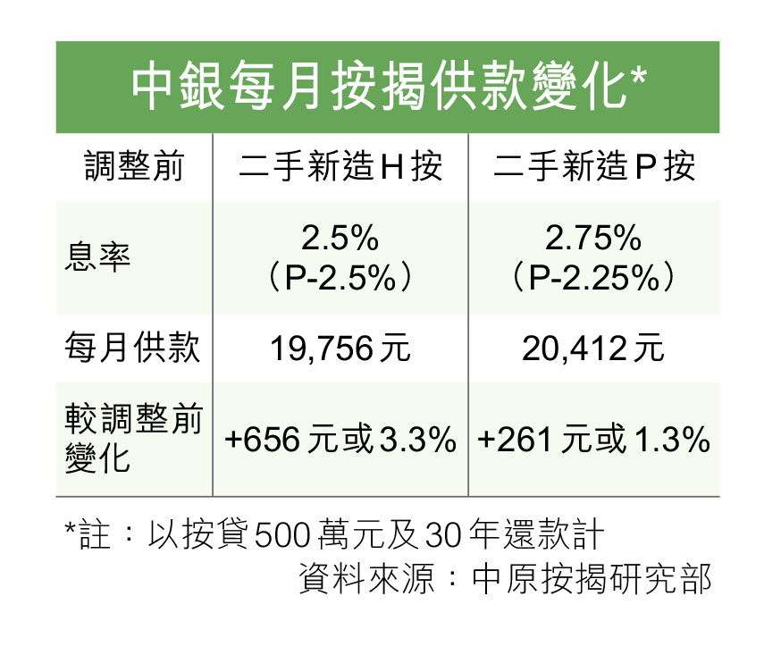 繼早前有大型銀行調整新造H按封頂息後,中銀香港(2388)終於出手,「不對稱」調高拆息掛鈎(H按)及最優惠利率按揭(P按)。該行H按封頂息率加0.25厘,即實際息率2.75厘,與滙豐看齊,但P按僅加0.1厘,實際按息2.6厘(P-2.4厘),令H按實際按息比P按高出0.15厘,下周四(15日)生效,只適用於二手物業的申請。而每借500萬元的二手新造H按每月供多約656元,而P按則供多261元。分析估計,最快兩日內再有其他銀行跟隨。