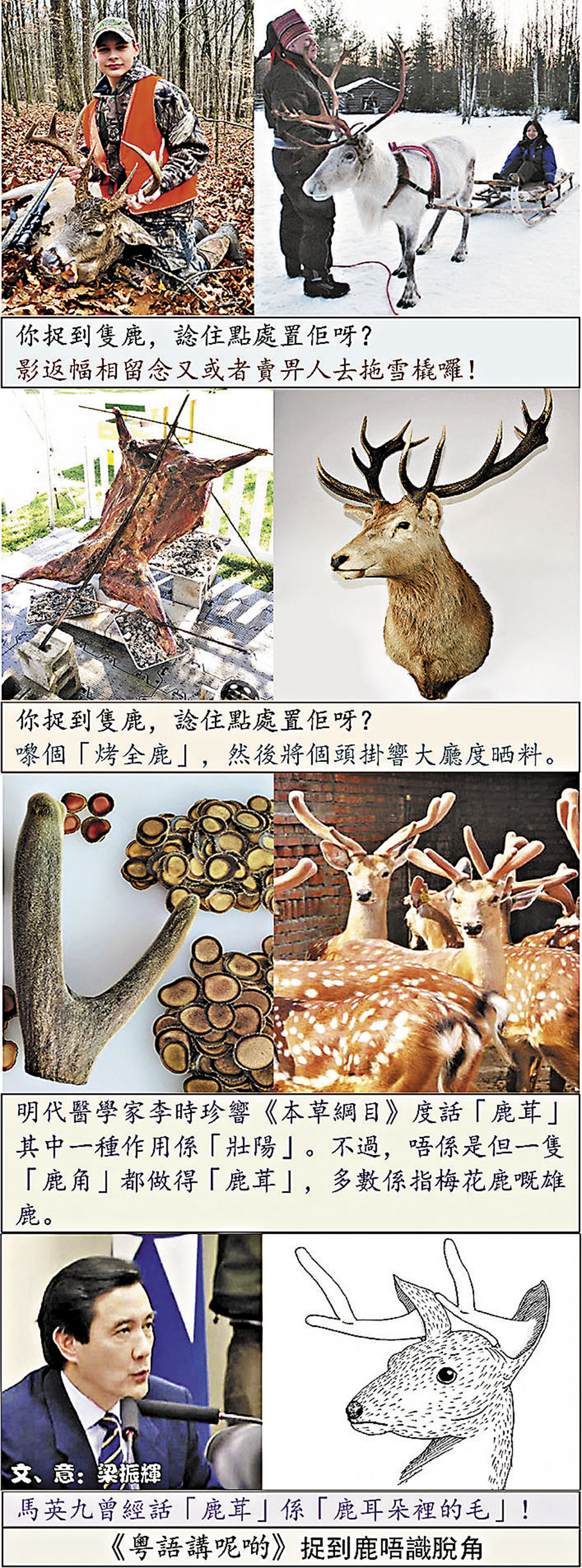 就圖中各人捉到鹿之後所選取嘅處置方式,廣東人會話佢哋「捉到鹿唔識脫角」。呢句廣東俗語就係話捉咗隻鹿返嚟,都唔曉得將佢隻角剝落嚟。點解咁講?