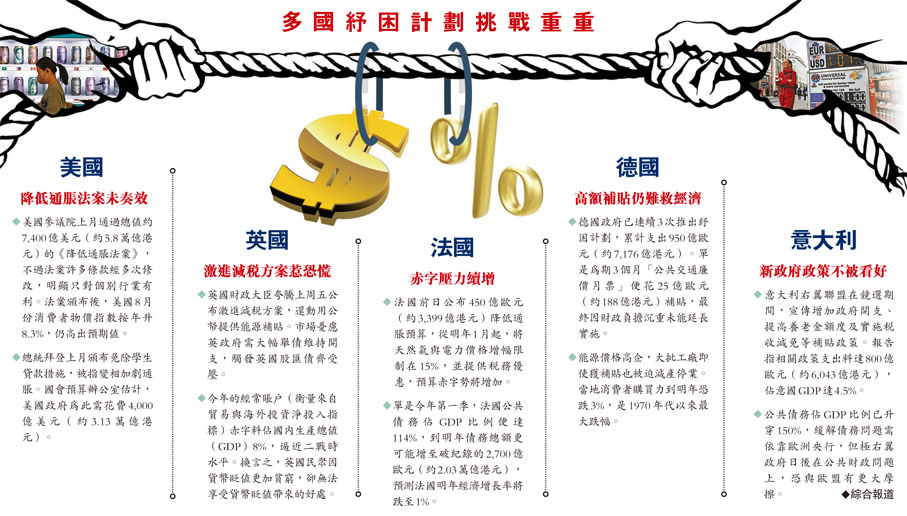 部分毫無章法的紓困計劃更恐怕會擾亂市場。英國財政大臣夸騰的大幅減稅方案和能源價格上限計劃,分別花費450億和1,500億英鎊(約3,823億和1.27萬億港元)資金,開支龐大卻不見開源措施,自然觸發市場恐慌,引發鎊匯危機和債券拋售潮。美國總統拜登政府免除數十億美元學生貸款,亦被指只會為美國通脹火上澆油。