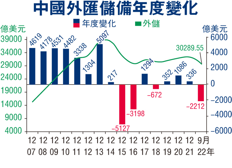 香港文匯報訊(記者 海巖 北京報道)受美元指數持續上漲和全球金融資產價格大跌影響,9月份中國外匯儲備下降259億美元至30,290億美元,降幅為0.85%,外儲規模已連續三個月下降但降幅有所收窄。專家表示,美元指數上漲疊加全球資本市場大幅波動,導致中國外匯儲備規模連續下降。另外,央行退出通過外匯儲備進行常態化干預人民幣匯率已久。對人民幣匯率貶值,專家普遍認為,短期有壓力,長期有支撐。