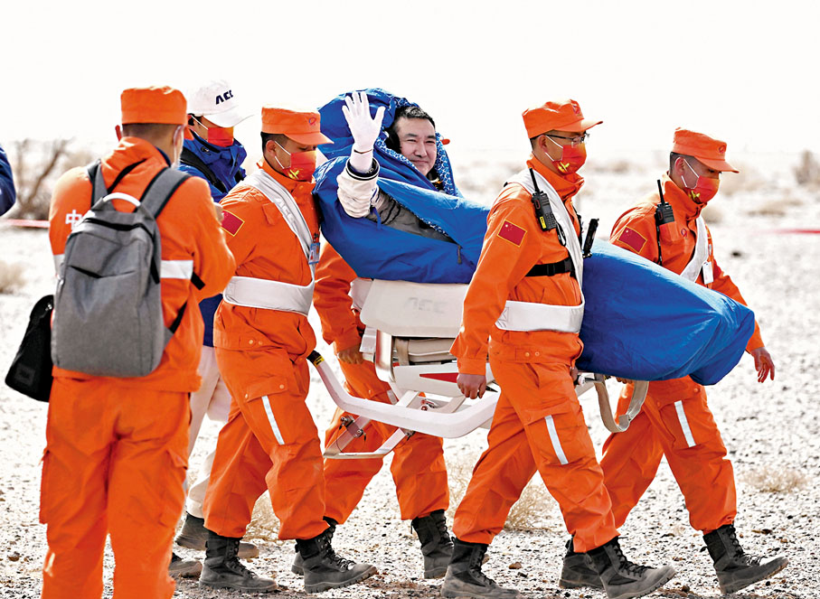 秦4月16日,神舟十三號載人飛船返回艙在東風着陸場成功着陸。圖為工作人員「抬走」航天員。資料圖片