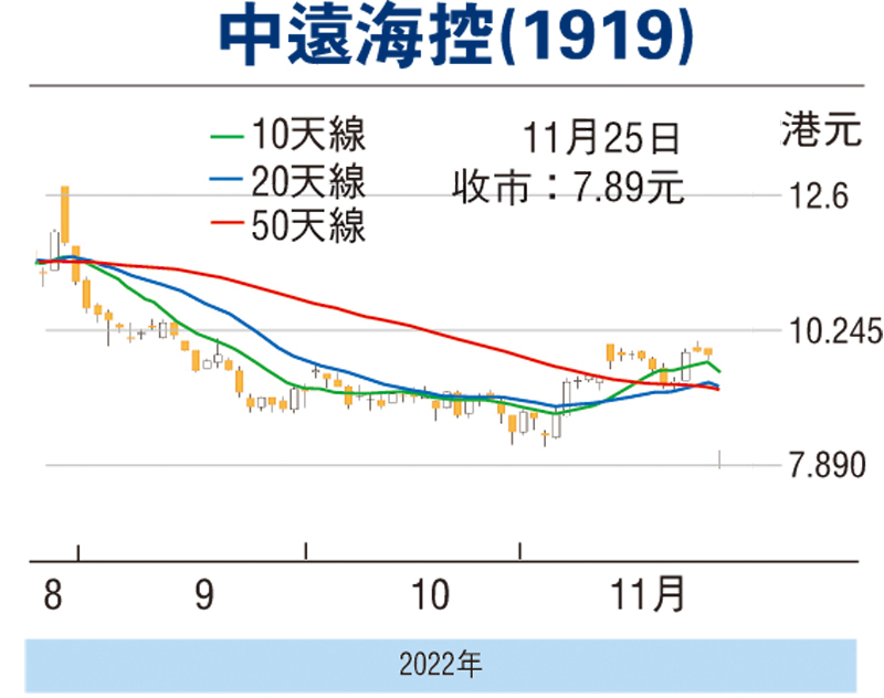 中遠海控(1919)中期息2.21元於昨日除淨,觀乎該股逆市下尚能保持向好走勢,曾高見8.15元,收報7.89元,仍升0.283元或3.72%。由於集團已明確了未來三年分紅比例及持續發布大股東增持、回購進展等,而對於近期的股價下行,管理層亦表示非常關注,大股東也啟動了兩輪增持計劃,在估值相對偏低,息率則頗為不俗下,不妨考慮趁低部署吸納。