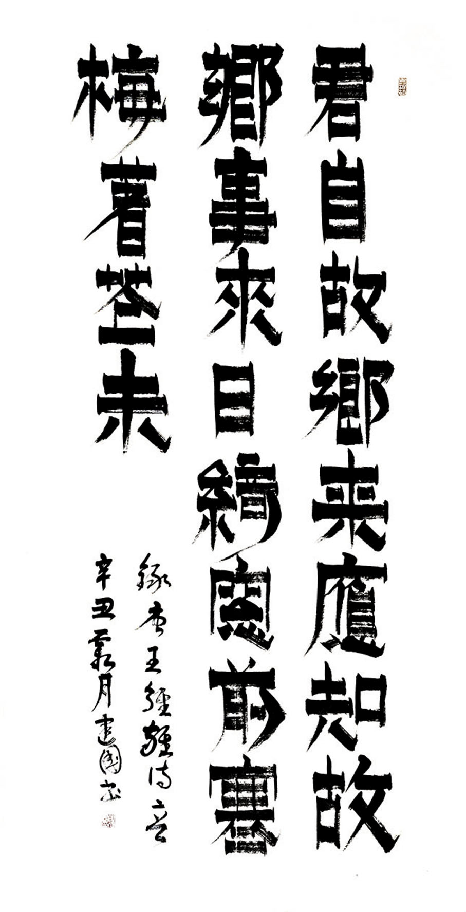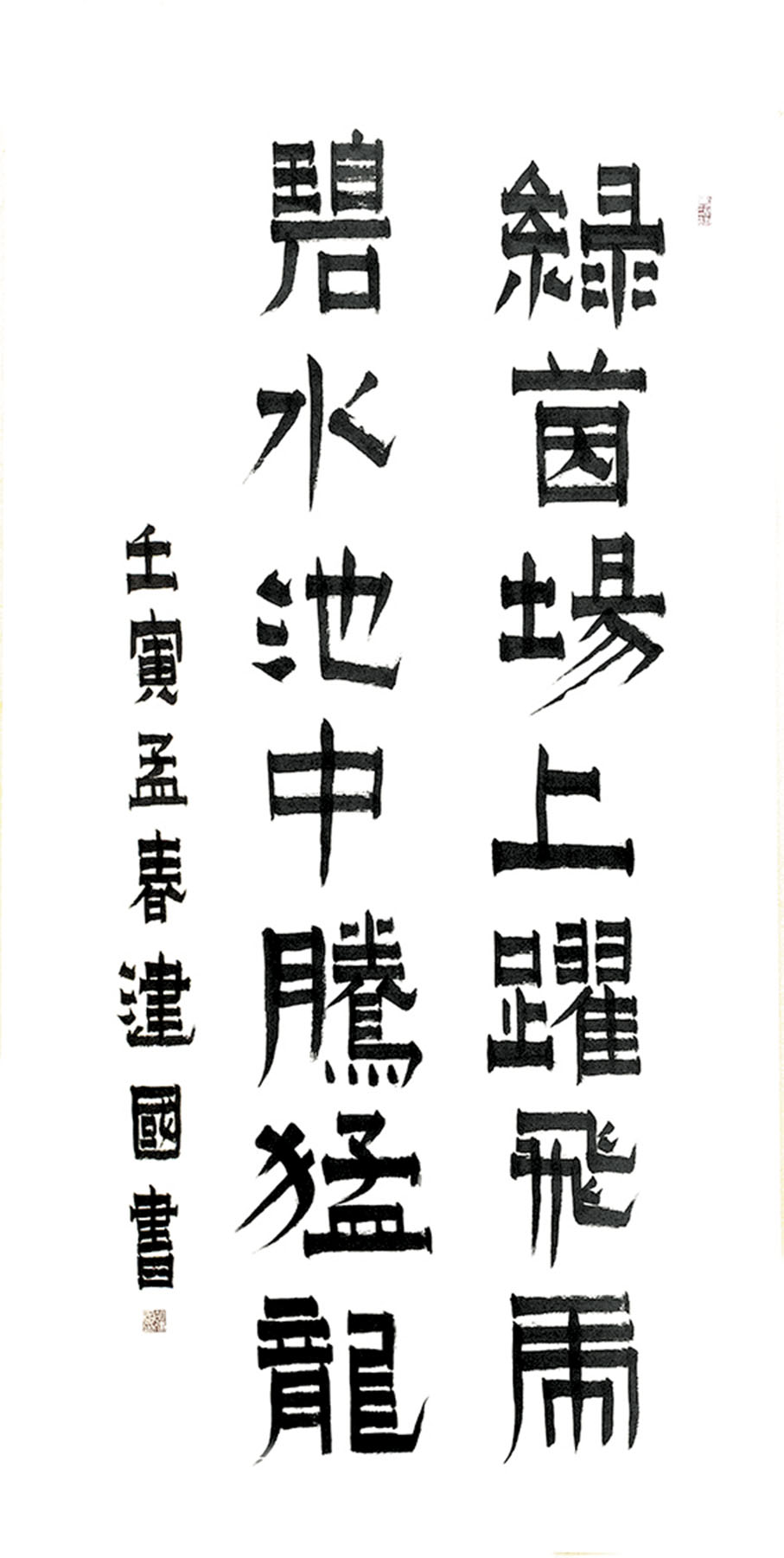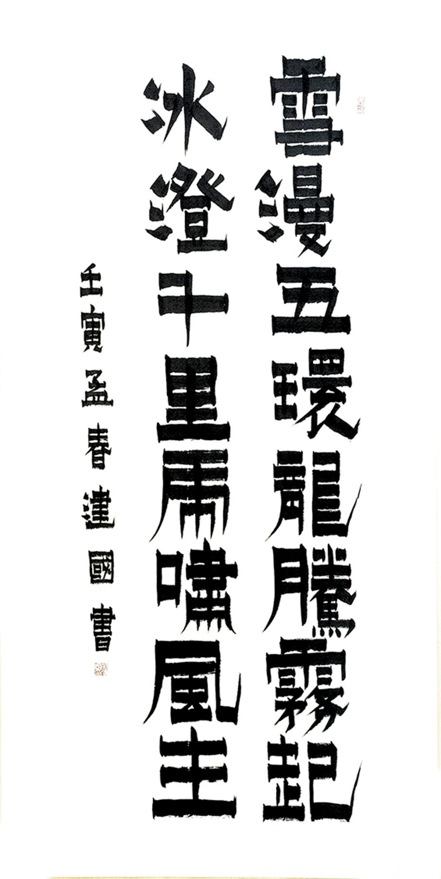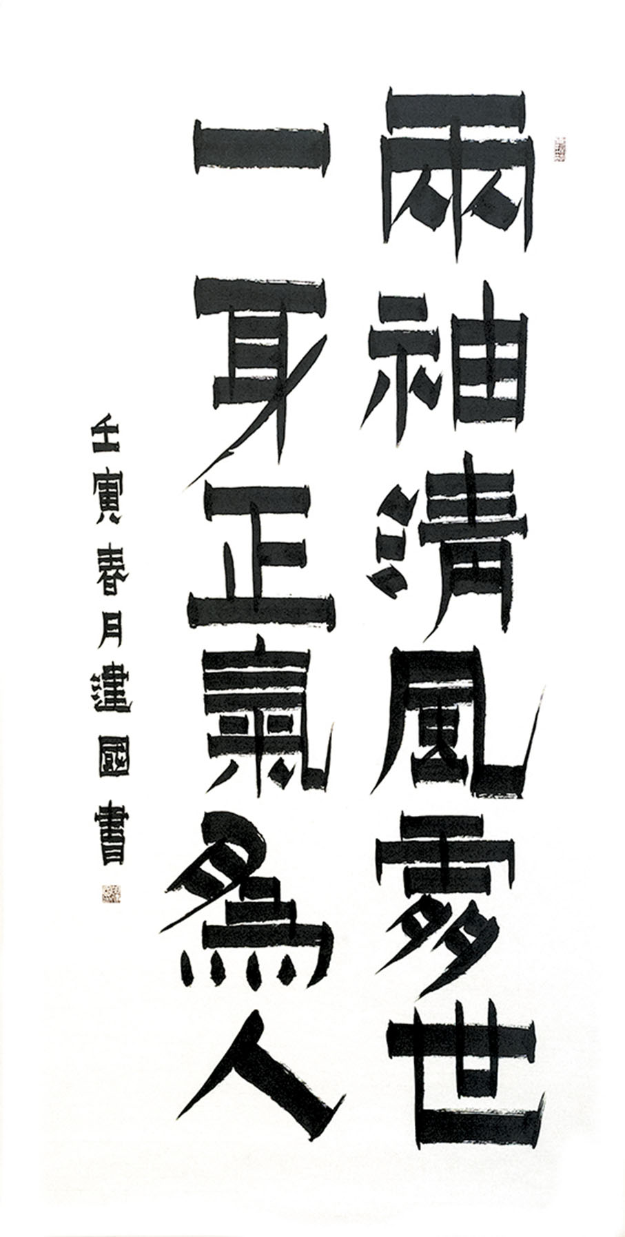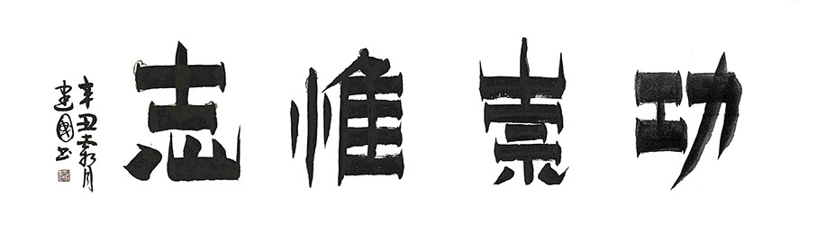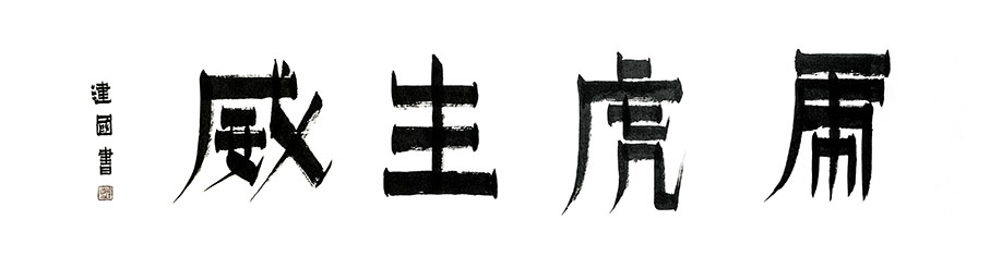俗話說:字如其人,漆書行筆只折不轉,用筆率真,筆墨醇厚,破圓為方少了圓滑,多顯剛正,做事就要像漆書的豎畫一樣纖細含蓄而不失英雄本色,做人要像橫畫一樣樸素簡潔,毫無做作之感,從大處着眼而不失磅礡的氣韻,其字體斬截、爽直和渴筆八分,也符合胡建國的性格和人生態度。