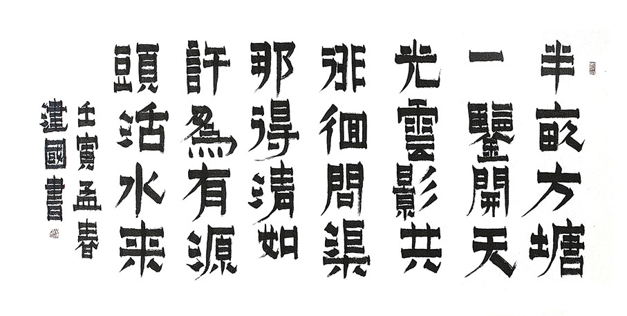 說起漆書,應該是十年前, 胡建國在網上欣賞書法作品時,發現了金農的漆書作品,被筆畫方正,稜角分明,橫畫粗重而豎畫纖細、墨色烏黑光亮,猶如漆成的書寫特點深深震撼並吸引了,胡建國說:「當時我就迫不及待地進行了一段時間的臨摹,雖然略有形似,但是由於我的書法功力尚淺,難得神采,練習了一段時間後就放棄了,繼續臨習楷書和行草,後來又臨習隸書。」