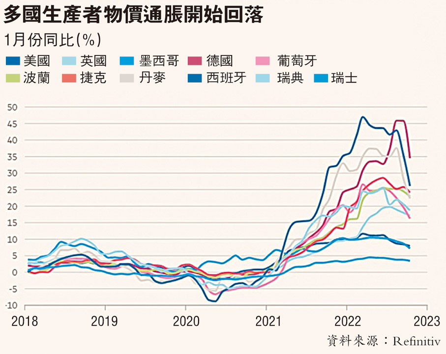 全球大宗商品價格也在下跌。聯合國糧農組織的糧食價格指數上月按年漲幅放緩至1.9%,遠低於去年5月的40%。荷蘭基準TTF歐洲天然氣價格亦回落至每兆瓦時130歐元(約1,063港元)以下,低於今年8月的311歐元(約2,543港元)峰值。在新冠疫情期間一度上漲5倍多的全球航運費用,現時也基本恢復至疫情前水平。