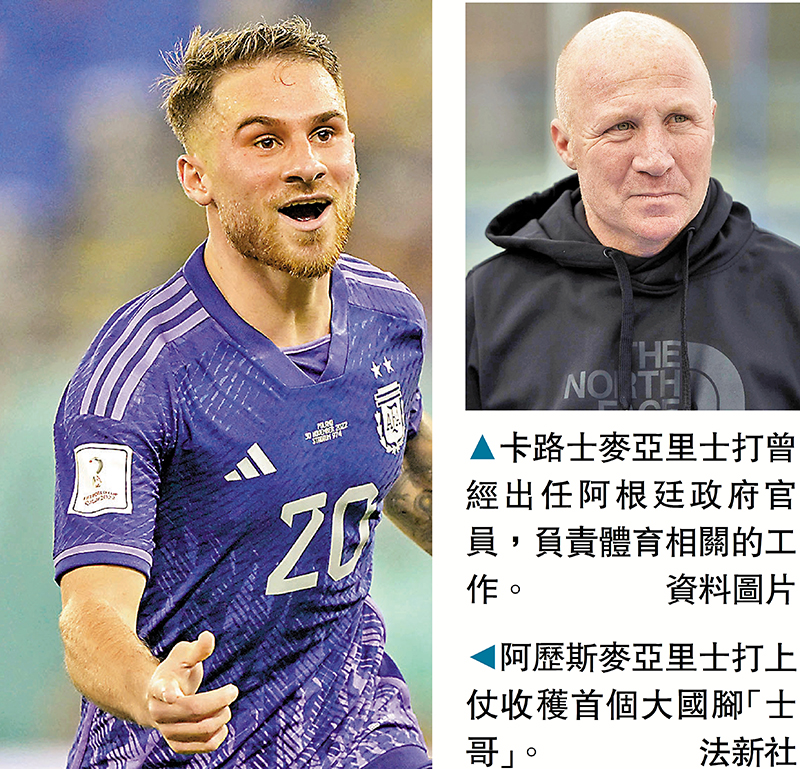 香港文匯報訊(記者 楊浩然) 阿根廷在最後一輪對波蘭的分組賽,憑効力英超白禮頓的阿歷斯麥亞里士打(阿歷斯)奠勝,據外媒報道,這位23歲中場出身於足球世家,其父親也是前阿根廷國腳,但目前看來阿歷斯麥亞里士打的成就,可能將更勝父親。