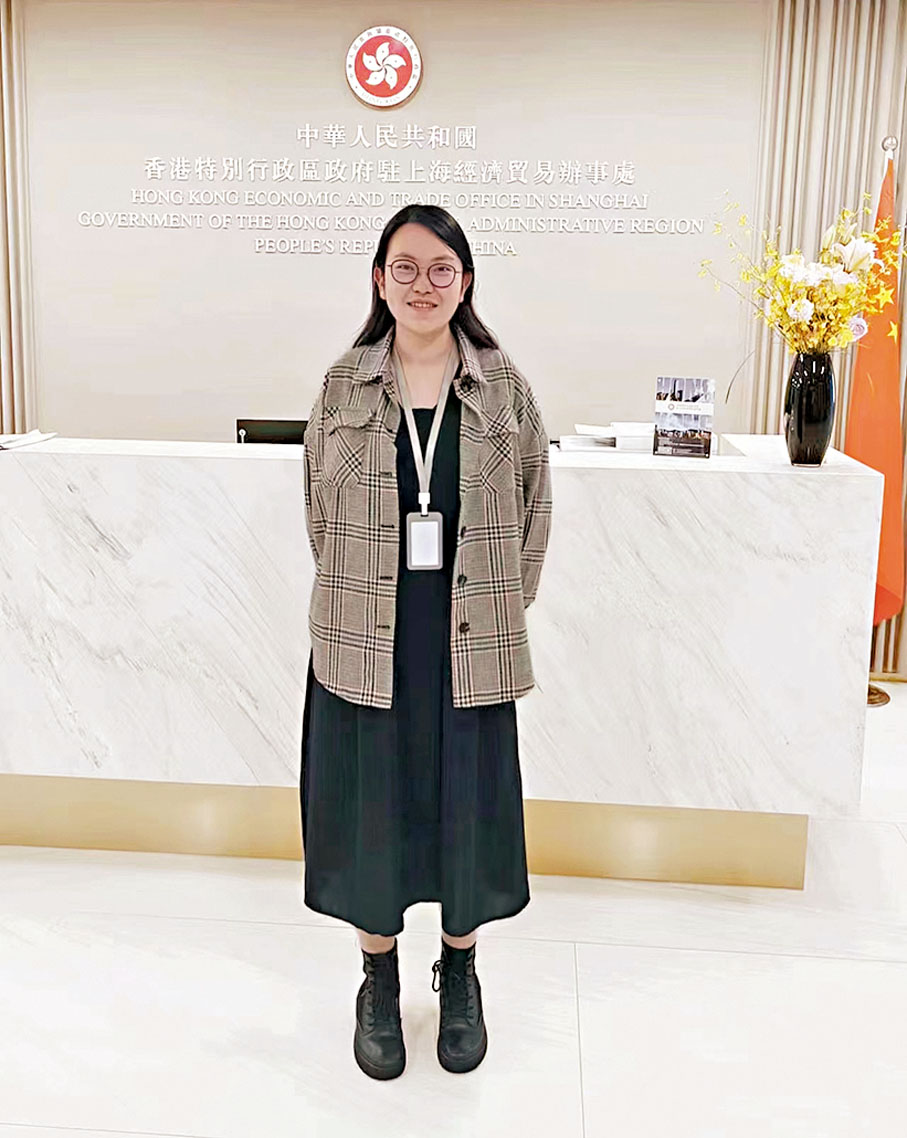 就讀於上海外國語大學的港生趙盈,今年參加了滬港青年會主辦的實習計劃活動,她得到了在香港特區政府駐上海經濟貿易辦事處實習的機會,成為了投資推廣組的實習生。在實習期間,趙盈主要協助投資推廣組的工作,包括對到訪企業進行北京調查,撰寫草擬和修改日常的訪問報告以及發言稿等文件。「當時印象最深的是我還參與了在杭州與合肥舉辦的研討會,包括進行演示文稿的修改以及參與人員的信息確認等,這類大型的活動讓我見識到了祖國更多地方的風土人情,也感受到了祖國發展得越來越好,所以我想要繼續在內地深造學習,提升自己的專業能力。」